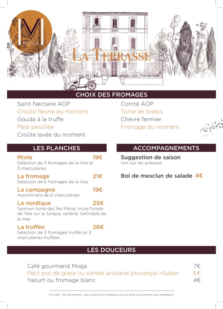 Si vous cherchez un endroit où déjeuner en terrasse, et ce bien que nous ne soyons pas un restaurant avec terrasse au sens stricte du terme, vous trouverez toujours de quoi choisir à la carte des produits artisanaux de qualité comme une planche de fromages fermiers, une planche de charcuterie, une assiette pleine de fraîcheur de tomates et Brocciu corse ou dégusterez une planche apéro à partager, composée par vos soins parmi les produits de notre fromagerie et épicerie fine. Nous vous proposons un lieu en extérieur à la fois convivial et tranquille, au coeur du centre à deux pas de la Sorgue, où vous pourrez entre amis boire un verre en terrasse à l’Isle-sur-la-Sorgue et ainsi profiter des journées ensoleillées de Provence et des longues soirées d’été chères au Sud de la France.